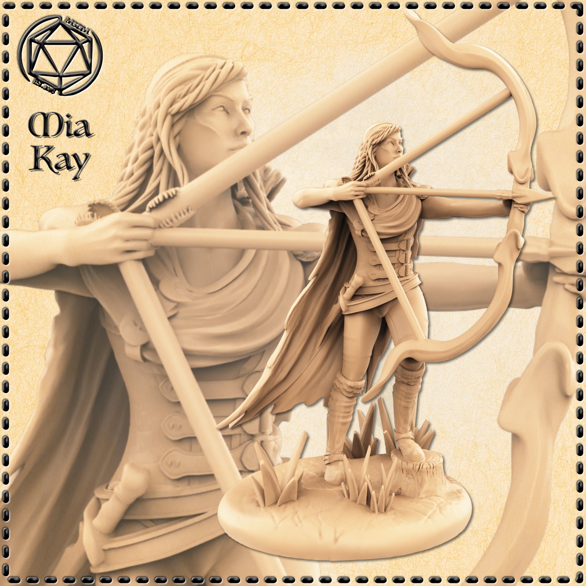 Her long hair trails behind her in vine-like strands, woven with feathers, twigs, and the occasional tiny flower that blooms purely for dramatic effect. A carved wooden bow rests in her grip, its limbs shaped from polished branches, the string drawn back with the calm focus of someone who has never missed — and never needed a second warning shot.