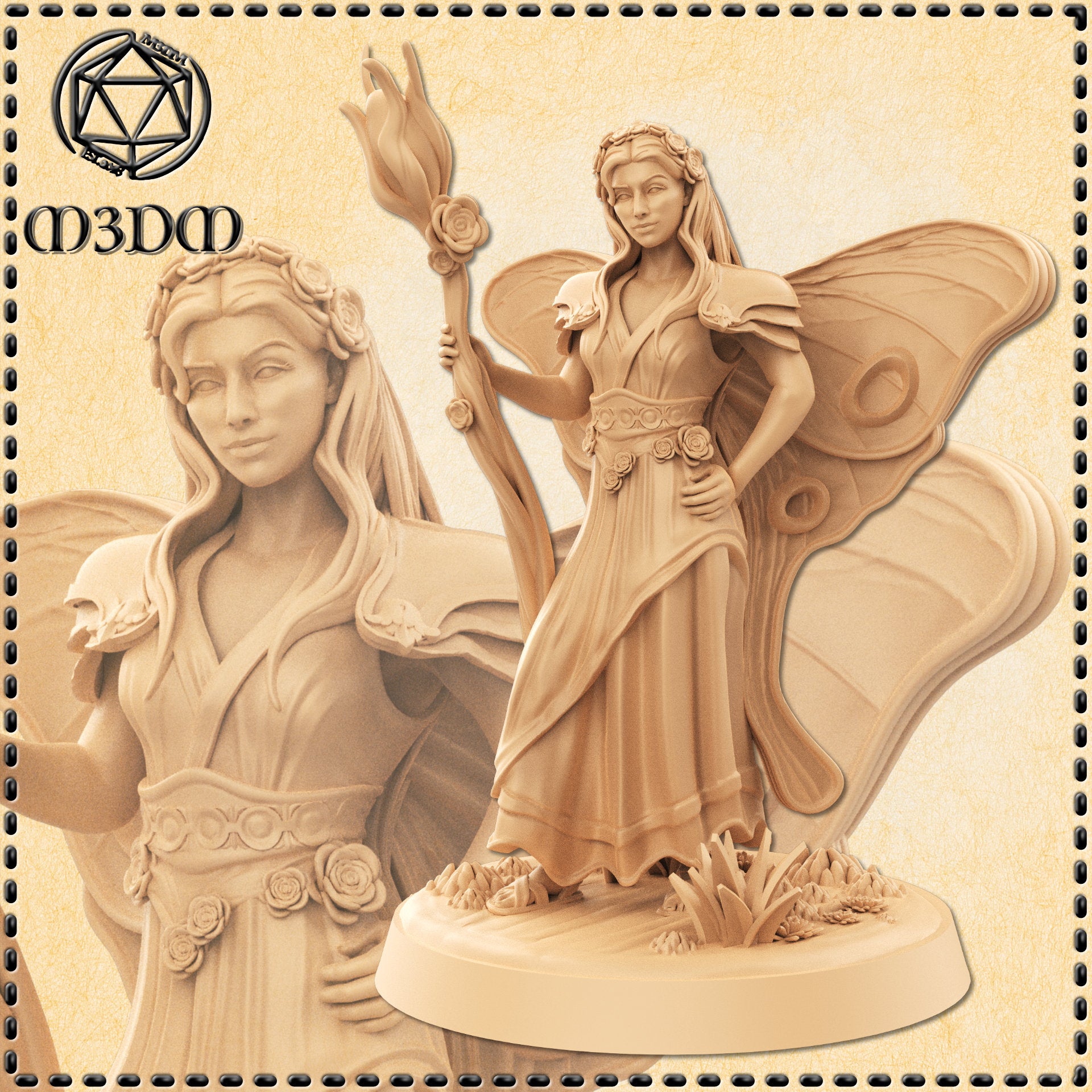 Her gossamer wings arch gently behind her, patterned like stained glass petals and posed mid-fold, as if she just landed to “check on something” (that something is you, and you are being evaluated). Her hair tumbles in soft, messy curls threaded with tiny flowers, bits of moss, and one very determined ladybug.