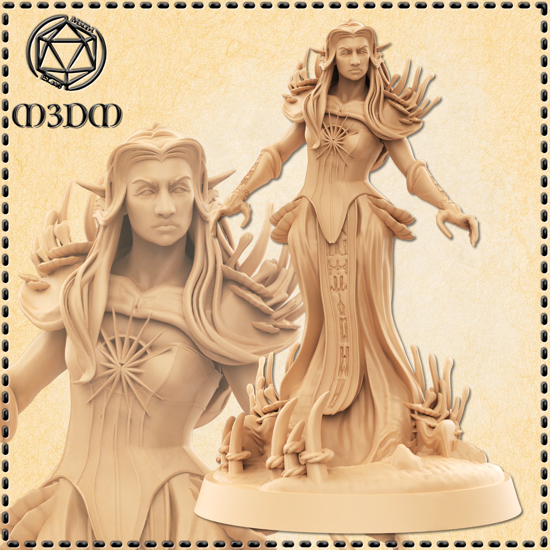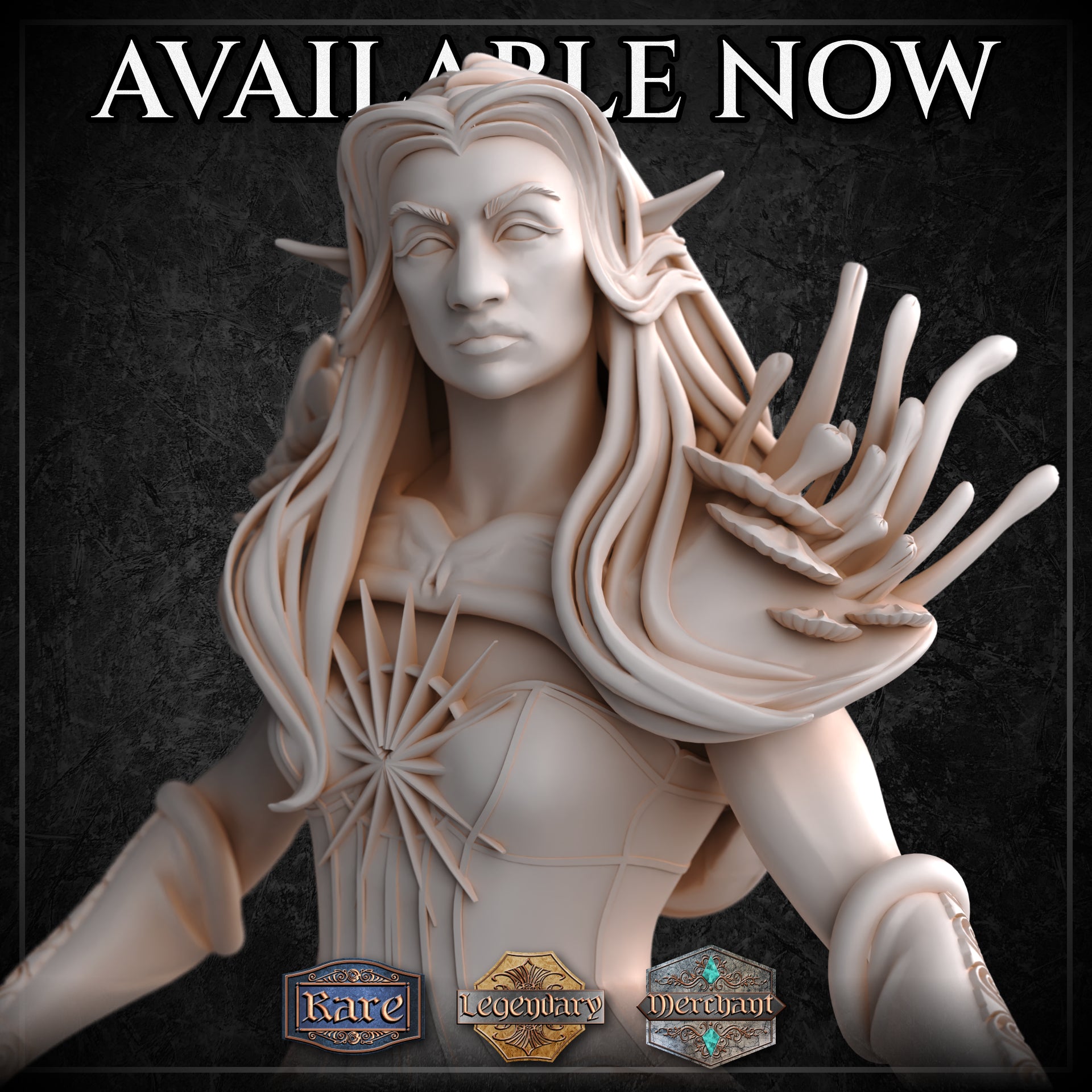 Her long hair falls in thick waves over her shoulders, threaded with small beads, bone charms, and a few leaves that absolutely should have wilted by now but are somehow still thriving. Her features are strong and serene, with high cheekbones, long ears, and just the faintest hint of fangs visible when she smiles — which she does often, and never for comforting reasons.