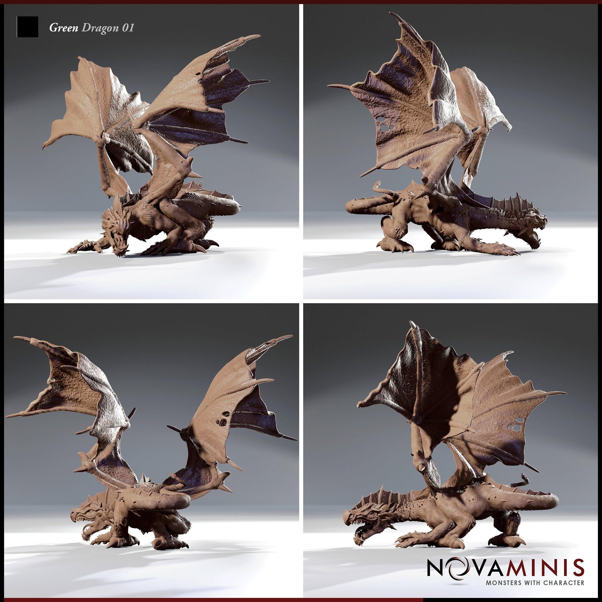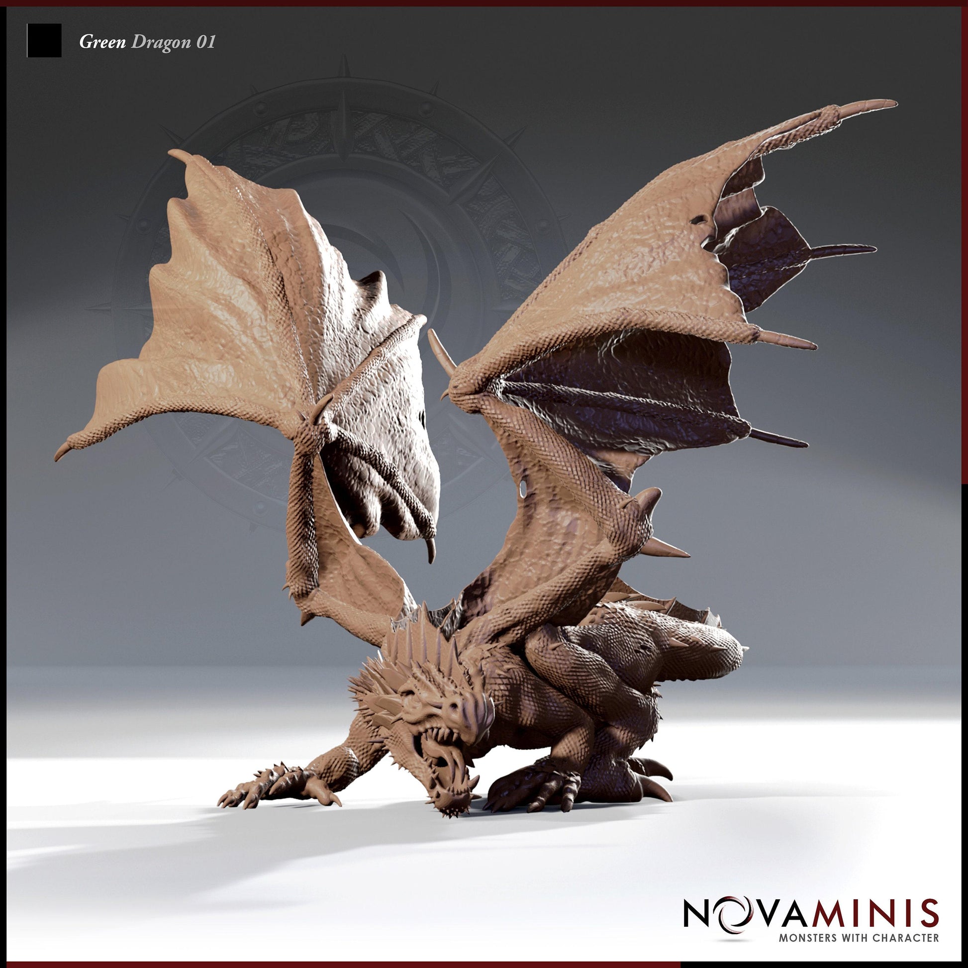 With partly extended folded wings and a bold stance, this adult Green Dragon is an intimidating predator. It's tattered wings speak of many battles won, and its scarred face is a testament to its noxious breath weapon!