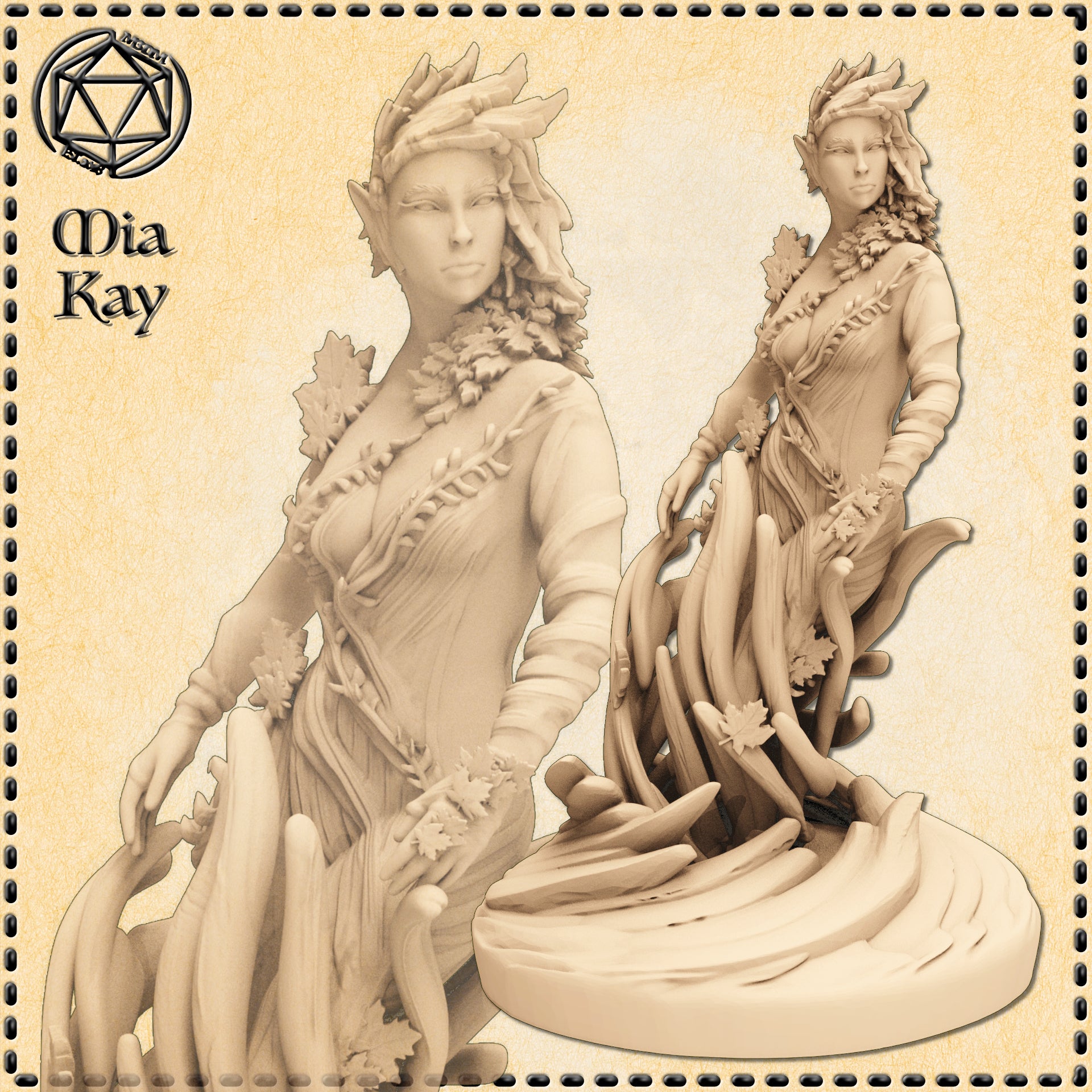 Her base is scattered with fallen leaves, curling vines, and tiny mushrooms, making it seem less like she’s standing on the forest floor and more like she rose directly out of it.