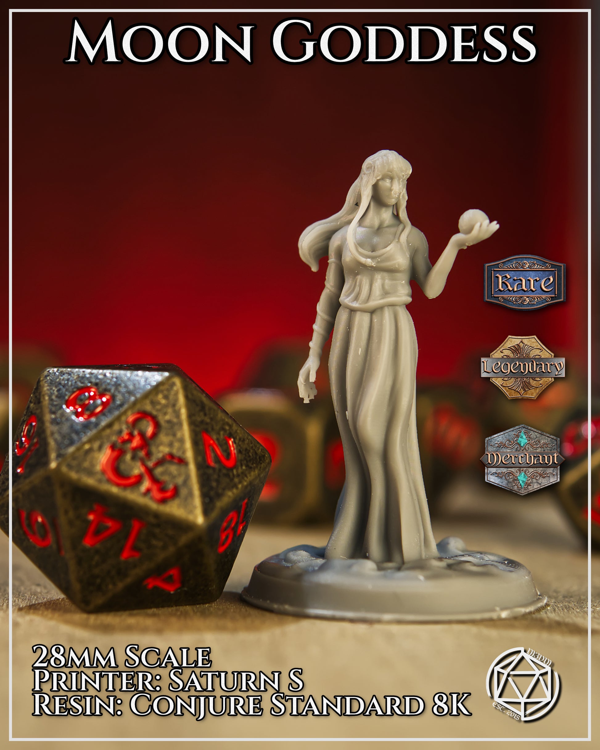 This luminous ruler of the night sky looks like moonlight took a graceful, divine form and decided to supervise the stars personally. Her figure is tall and elegant, with skin that gleams like polished pearl, faintly glowing with cool silver-blue light.