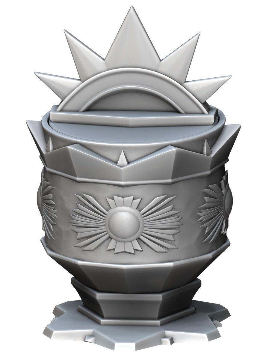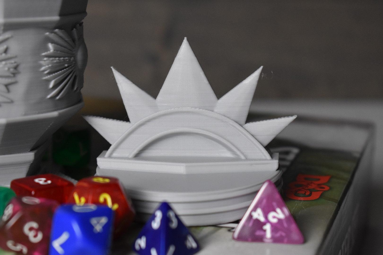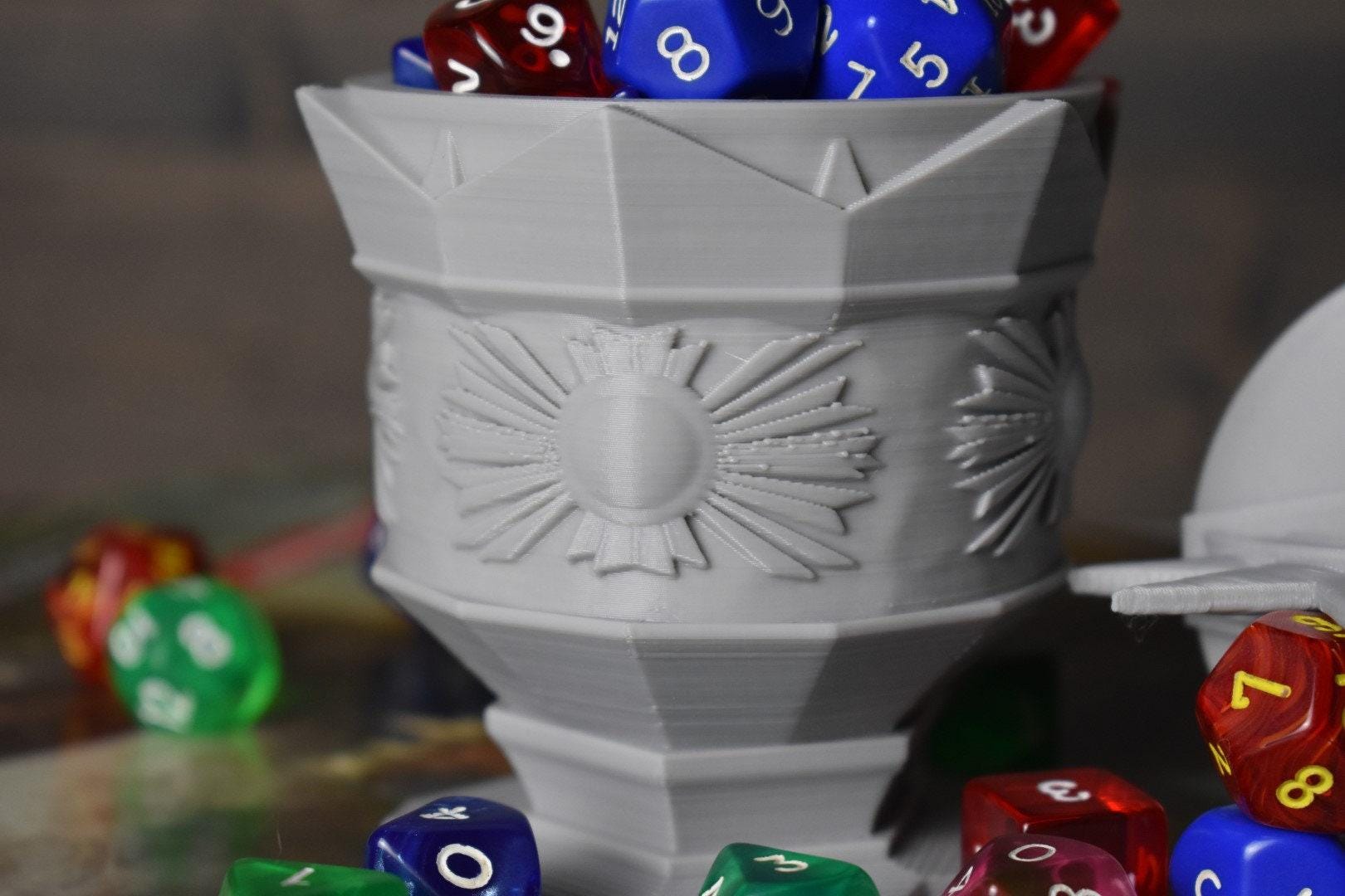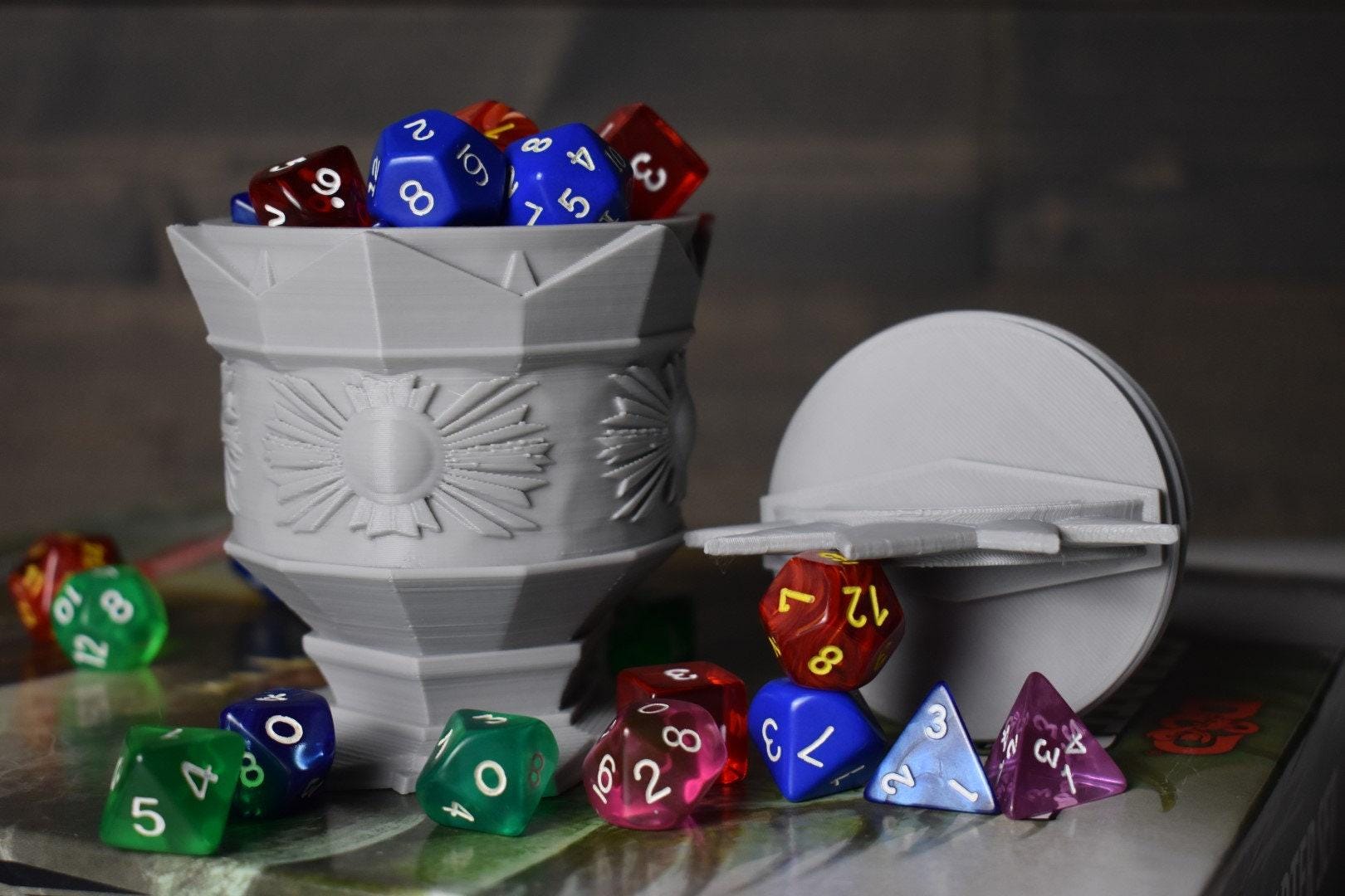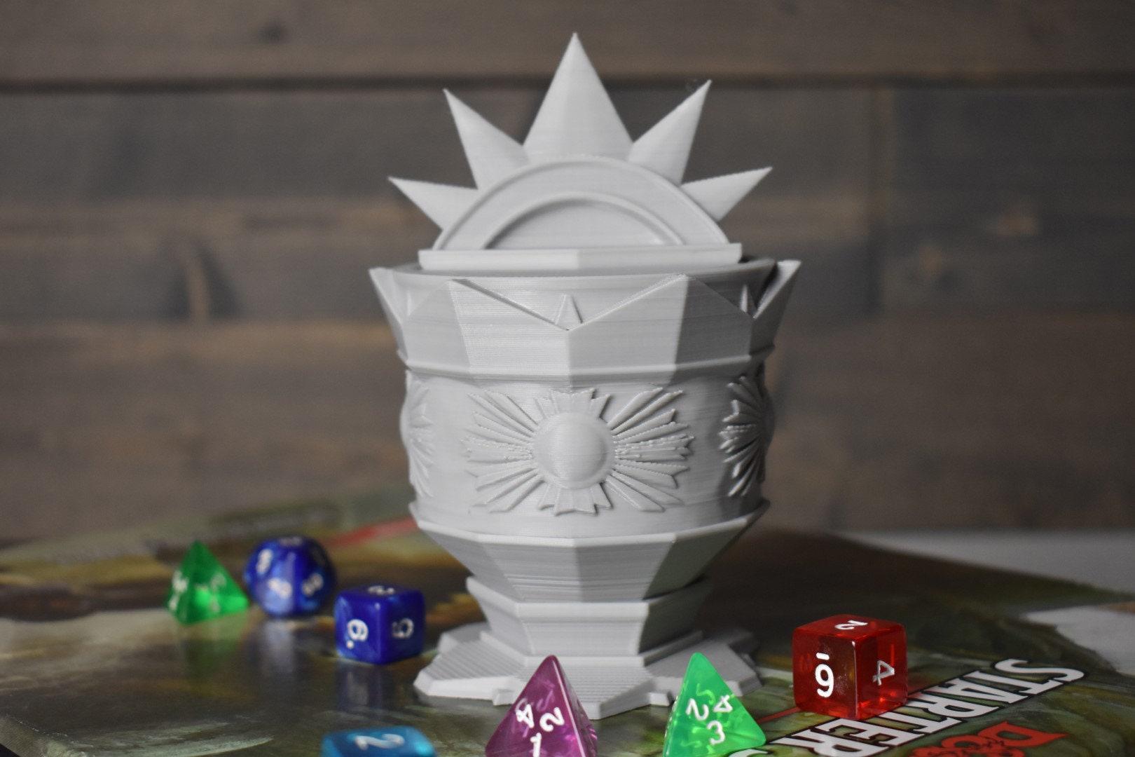 The Paladin Dice or Trinket Box is made by our own hands, right here in the USA. This can pour liquids; however, PLA is not food safe and we don't recommend consuming liquids from it.