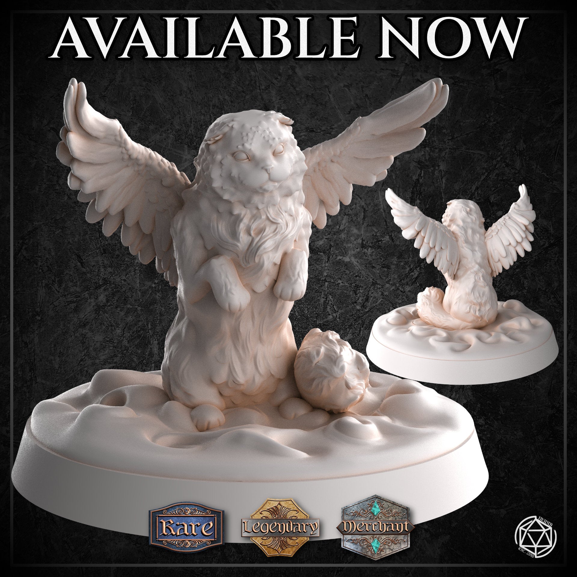 Soft, plush fur covers its chubby little body, sculpted with gentle fluff texture that makes it look extremely pettable and extremely likely to steal your spell components. From its shoulders sprout a pair of feathery wings, slightly oversized for its body, posed mid-flap as it hovers with chaotic grace.